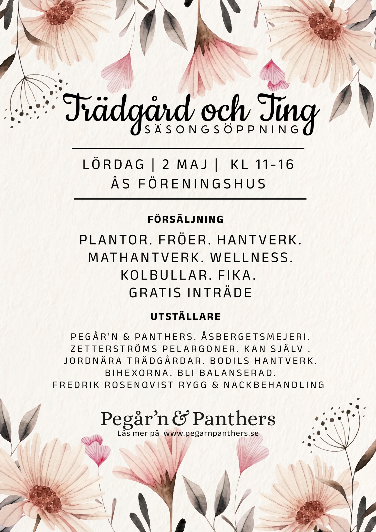 I år bjuder vi in till Trädgård & Ting på Ås Föreningshus, där vi tillsammans med våra vänner skapar en inspirerande dag fylld med plantor, trädgård, hantverk, mathantverk och wellness. Passa också på att komma och prata trädgård med oss, utbyta idéer och få tips inför säsongen. Det kommer dessutom att finnas fika, smörgåsar och kolbullar. Läs mer på vår Facebook Evenemang.